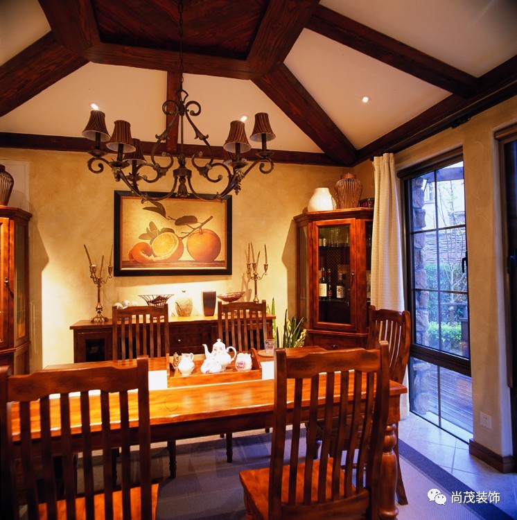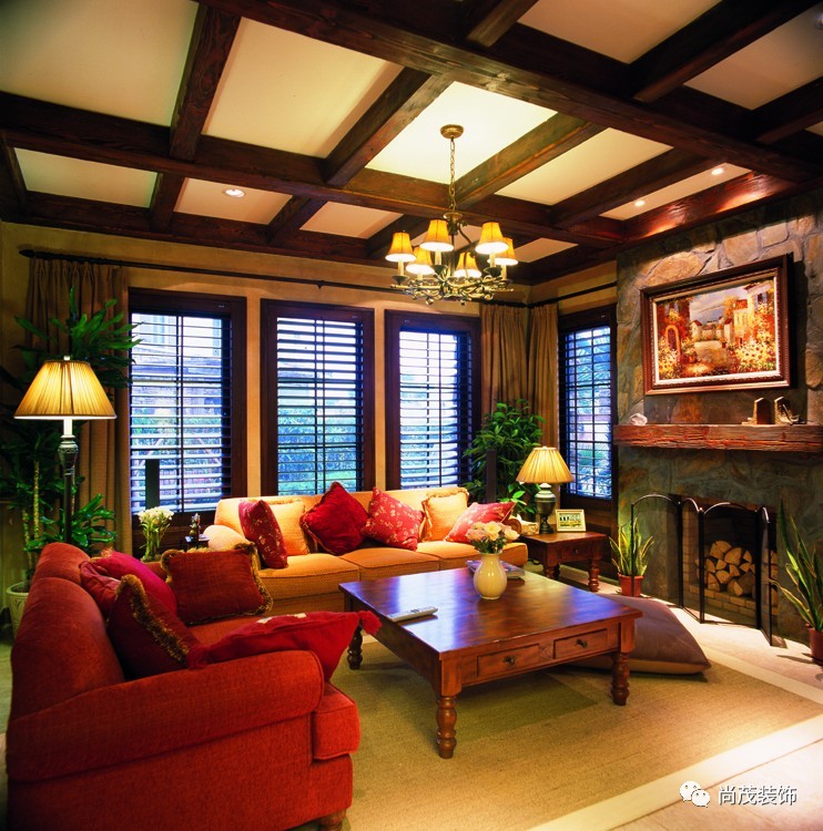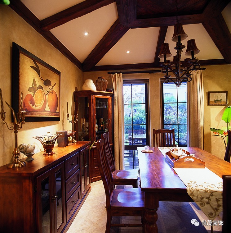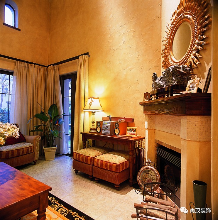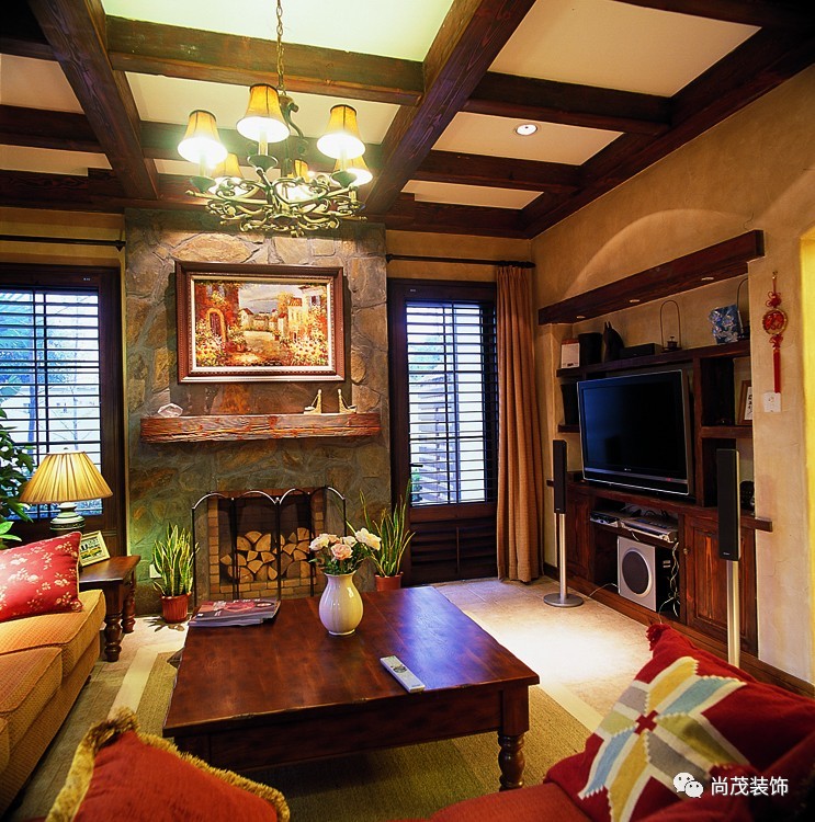 原木臺(tái)面的壁爐、粗曠的文化石背景、棉麻質(zhì)感的布藝以及古銅色的鐵藝吊燈,在留聲機(jī)流淌的音樂中,愈發(fā)懷舊的氣息。