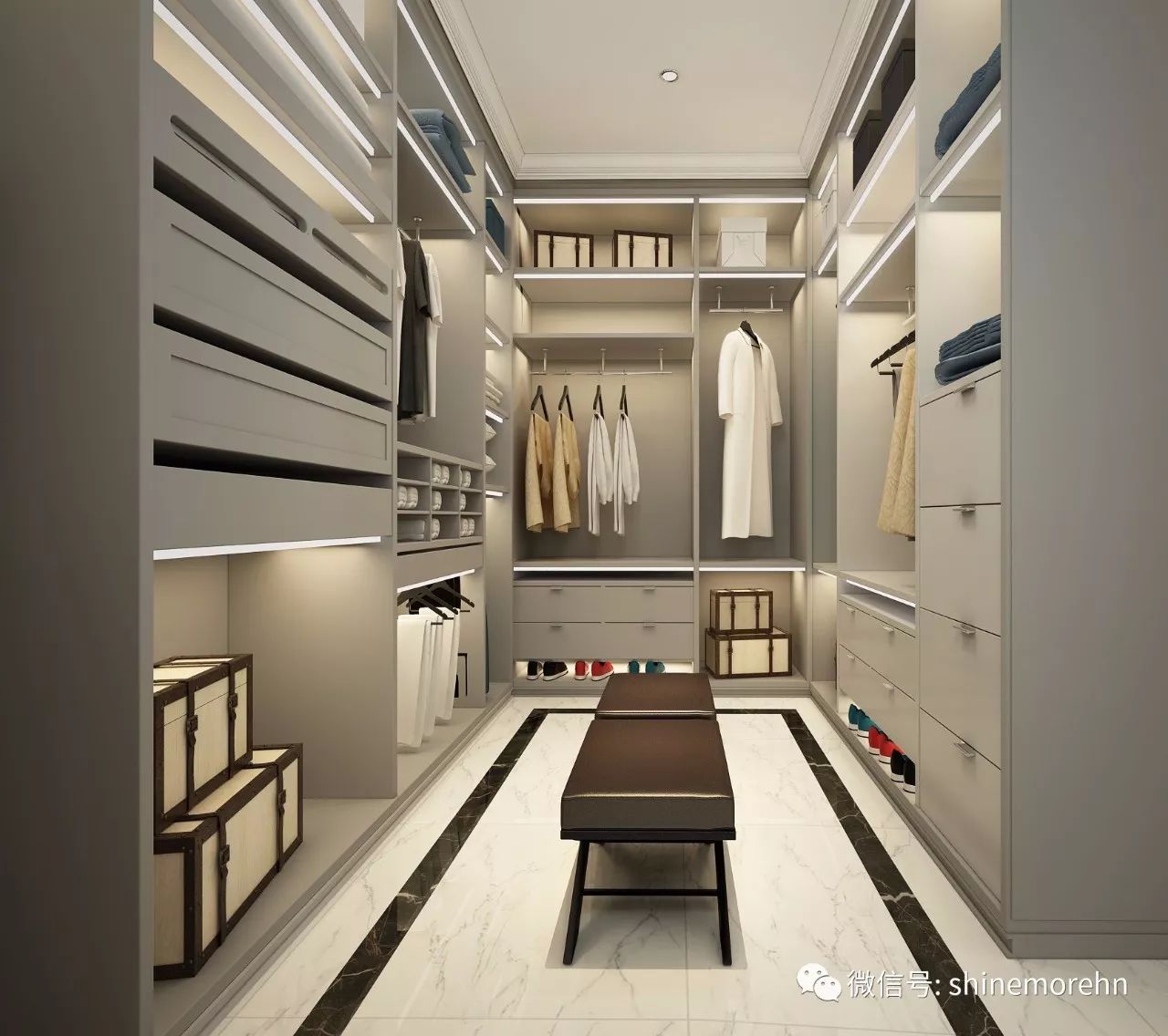 衣帽間講究分區(qū)合理,儲納空間豐富,是私人的收藏室。