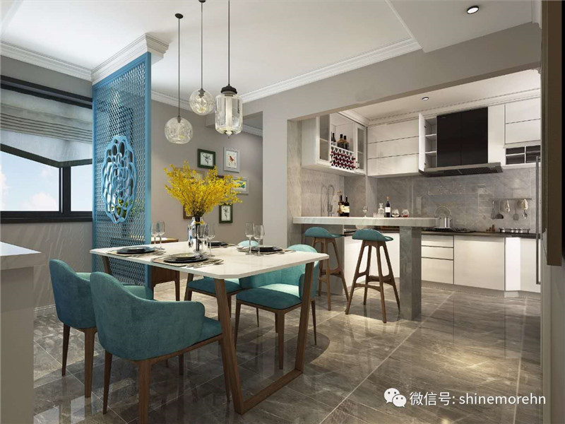 吧臺隔斷 廚房除了推拉門以外,喜歡開放式廚房的朋友則可以選擇做個小吧臺,它可以成為用餐區(qū),這樣一來不僅好看而且更好的提高了空間利用率。