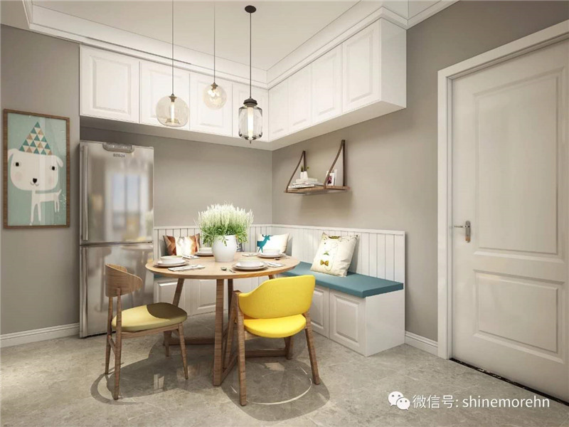 浪漫有情調的餐廳,墻面的收納柜的設計讓餐廳兼具儲物的功能。