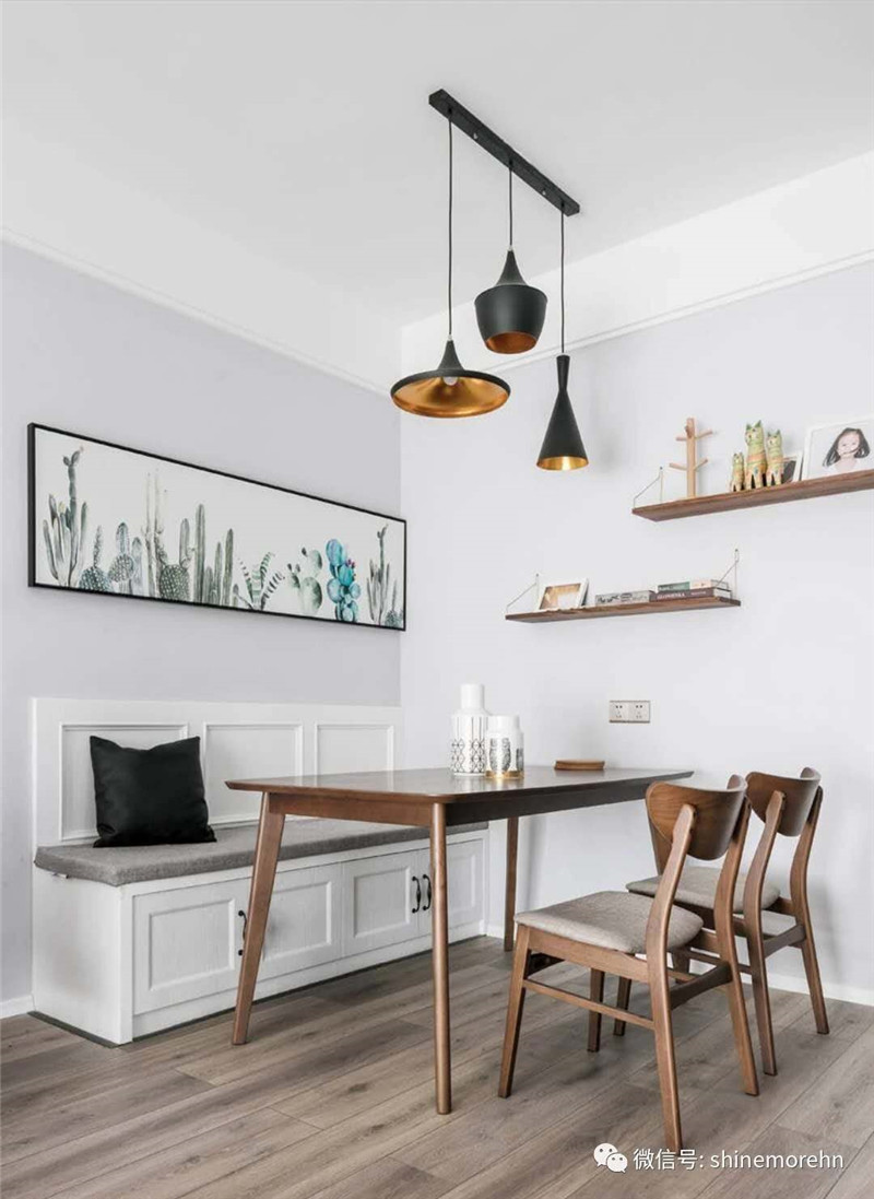 木質餐桌更有質感,同色系卡座互相協調,簡約不簡單。