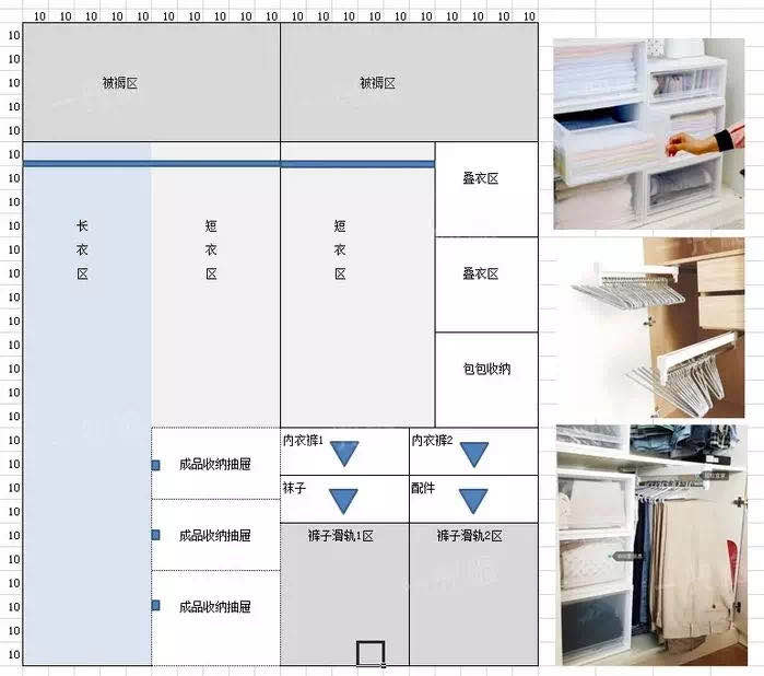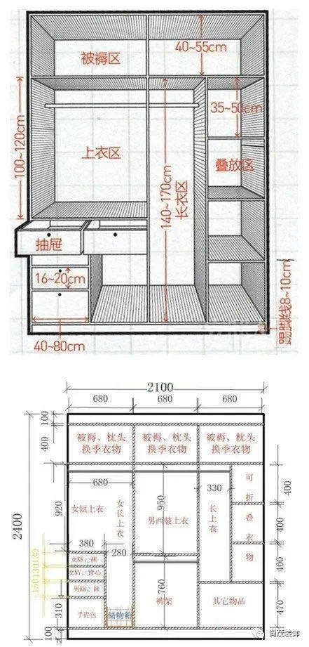 04 衣柜內部尺寸和分區設計很重要,很多屋主覺得自家衣柜不好收納和拿取,大多都是內部空間沒好好設計的緣故。一般設計衣柜時,頂部和底部需要留空一定的縫隙,預留縫隙是為了方便走石膏線和開關柜門,后期再用擋板填補