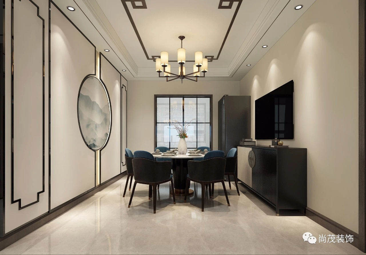 餐廳吊頂采用邊吊的形式來做,用黑色鈦金線條加以修飾,餐桌也采用圍合感更強的圓桌形式來做,是整個氛圍更加和諧,加上餐廳墻面的造型,整個餐廳更加美感十足。