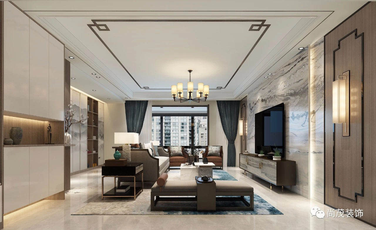 客廳吊頂跟餐廳一致,這樣做更加協(xié)調統(tǒng)一,由于電視背景墻較長,采用分段的形式來做,柜門更是以設計感較強的山水畫來做。
