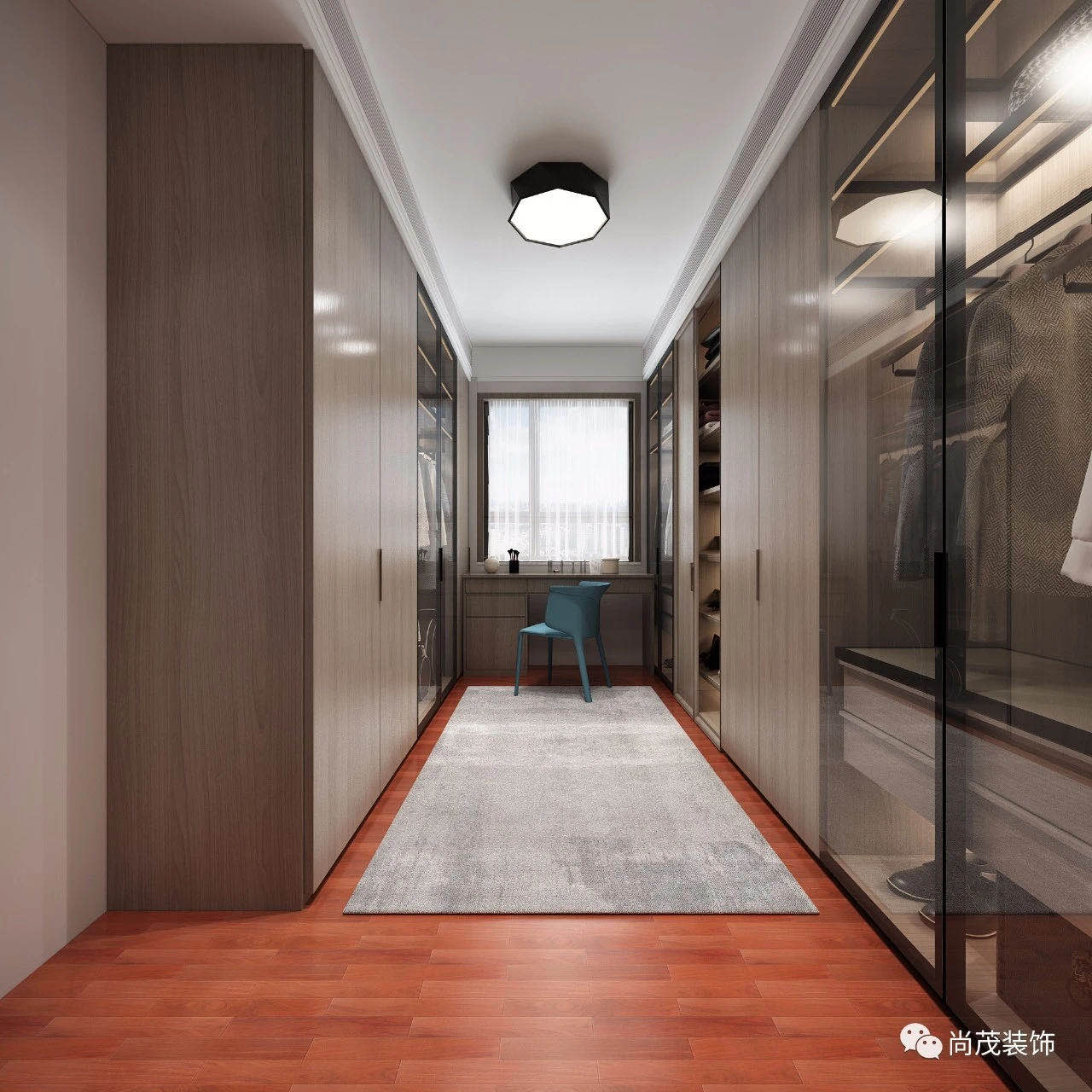 其中一間臥室改成衣帽間,增大了整個空間的儲物,雙排的衣柜做了通頂設計,簡潔整齊,超級實用的衣柜完全滿足了女主對儲物的需求。