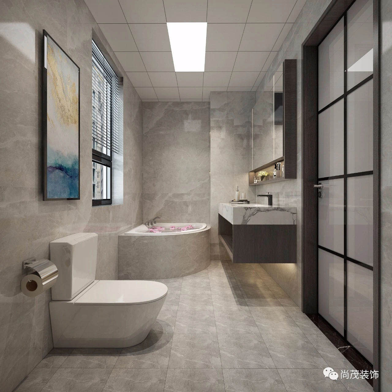 運用石材的紋理進行貫通,半圓型的浴缸更是增加了空間的舒適度,也使整個空間產生了流動感。。