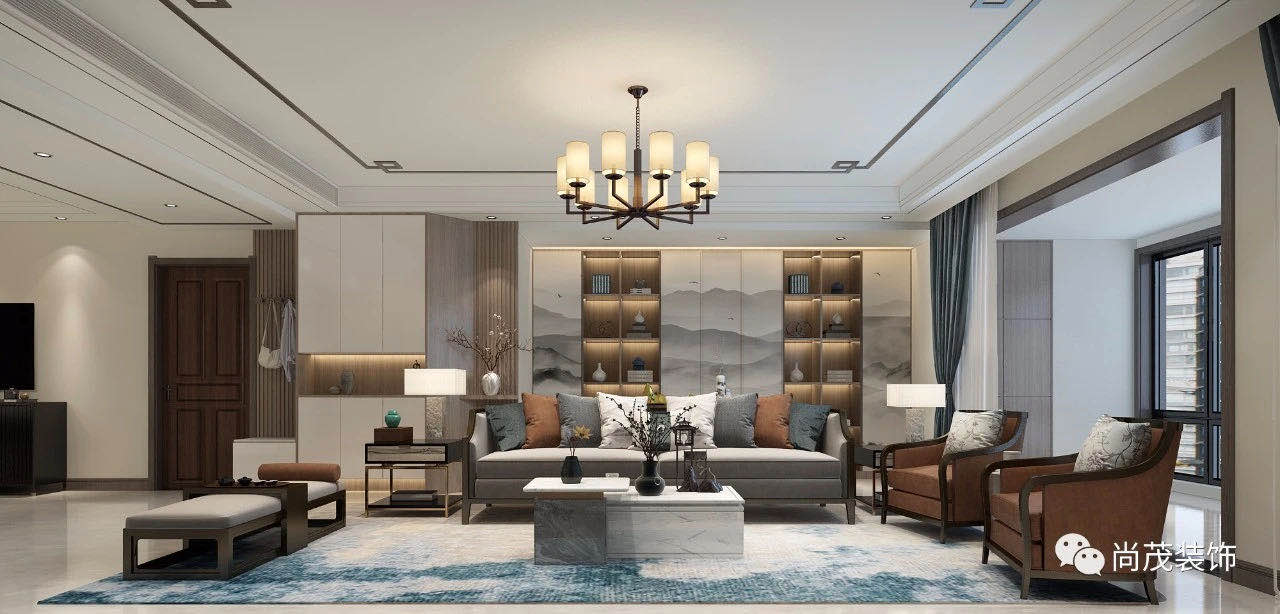 沙發(fā)后面利用書柜的形式來做,柜門更是以設計感較強的山水畫來做,柜門關上之后,會給人視覺的沖擊感。