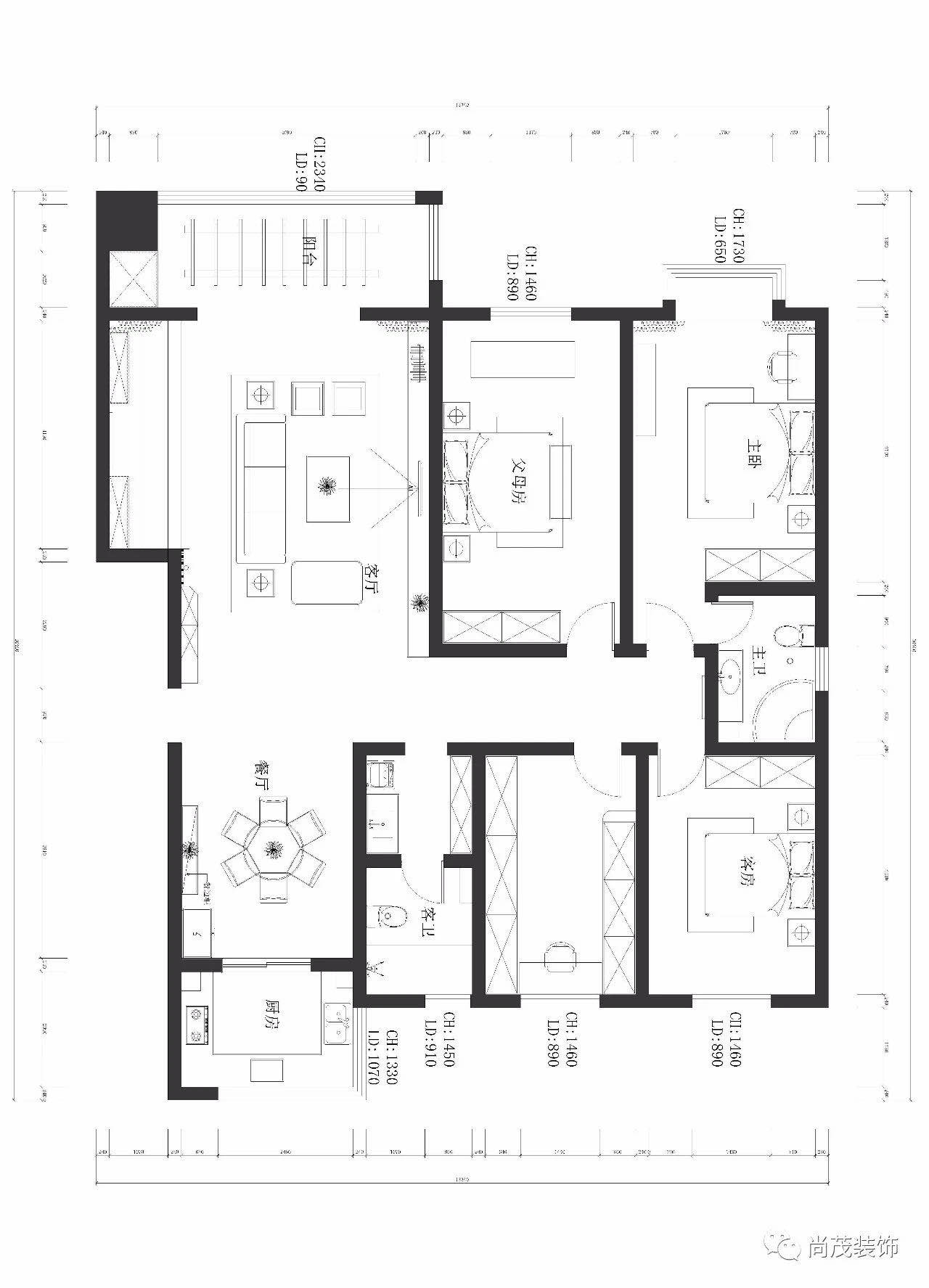 房子屬于南北通透的戶型,采光和通風效果都比較好,客餐廳面積比較大,所以在考慮方案的時候,融入了一些造型的設計來弱化客餐廳的空曠感。