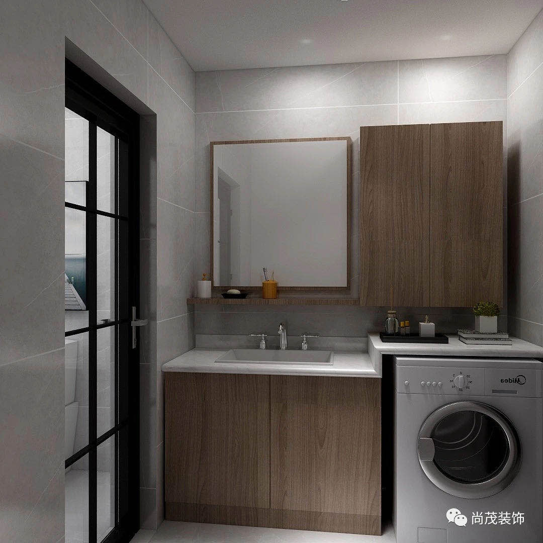 木質的浴室柜和洗衣機做了整體的結合,不但空間規(guī)整,也最大程度的增加了空間的利用感。
