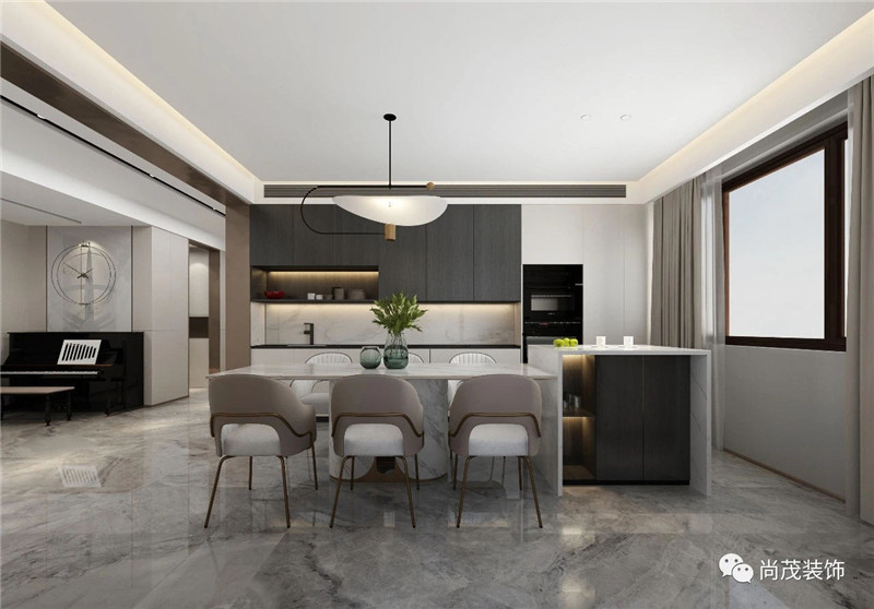 簡潔的造型設計,線條的設計語言,精巧的家具造型,訴說著空間氛圍的雅致,無形中透露著業主的生活品位,讓人在用餐時也能擁有輕松愉悅的心情。洗衣房的入口做成隱形門,與背景融為一體,整體協調美觀。