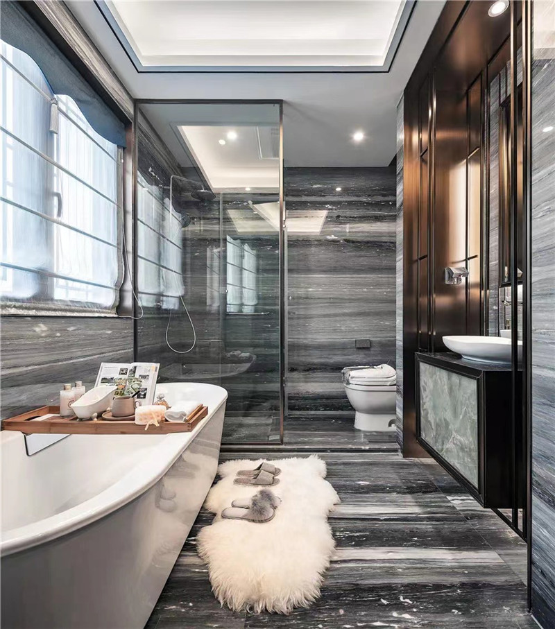 雅士白大理石背景墻沿著自然紋路切割,利用分明的線條拉開(kāi)空間的層次,顯得的更大氣。