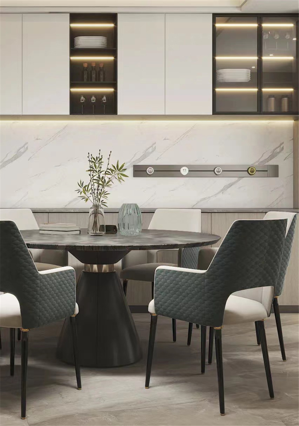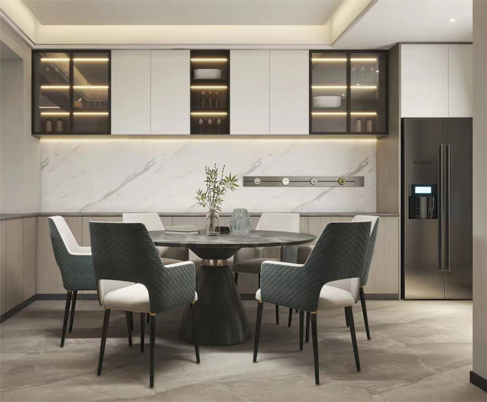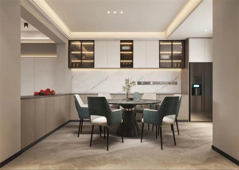 葷素百味,煙火人間。一家人用餐氛圍突出輕松愉悅,中廚在功能區域細分,"U"字型的設計更加有效利用空間,日常使用起來更加方便和人性,餐廳備餐區一整面墻的備餐柜,將一些廚房用品及烘焙用具全都收納進了柜體,酒柜用玻璃材質的柜門加上氛圍燈光區分開了其他柜體,整體和諧簡練,儀式感、氛圍感拉滿。
