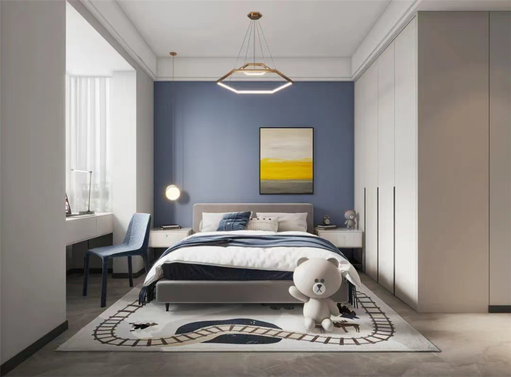 每個人都有自己獨特的個性,孩子也不例外。男孩房設計以霧霾藍為點綴色,配飾及家具的選擇上以簡約柔和為主,搭配小熊元素讓空間充滿了自然童趣。