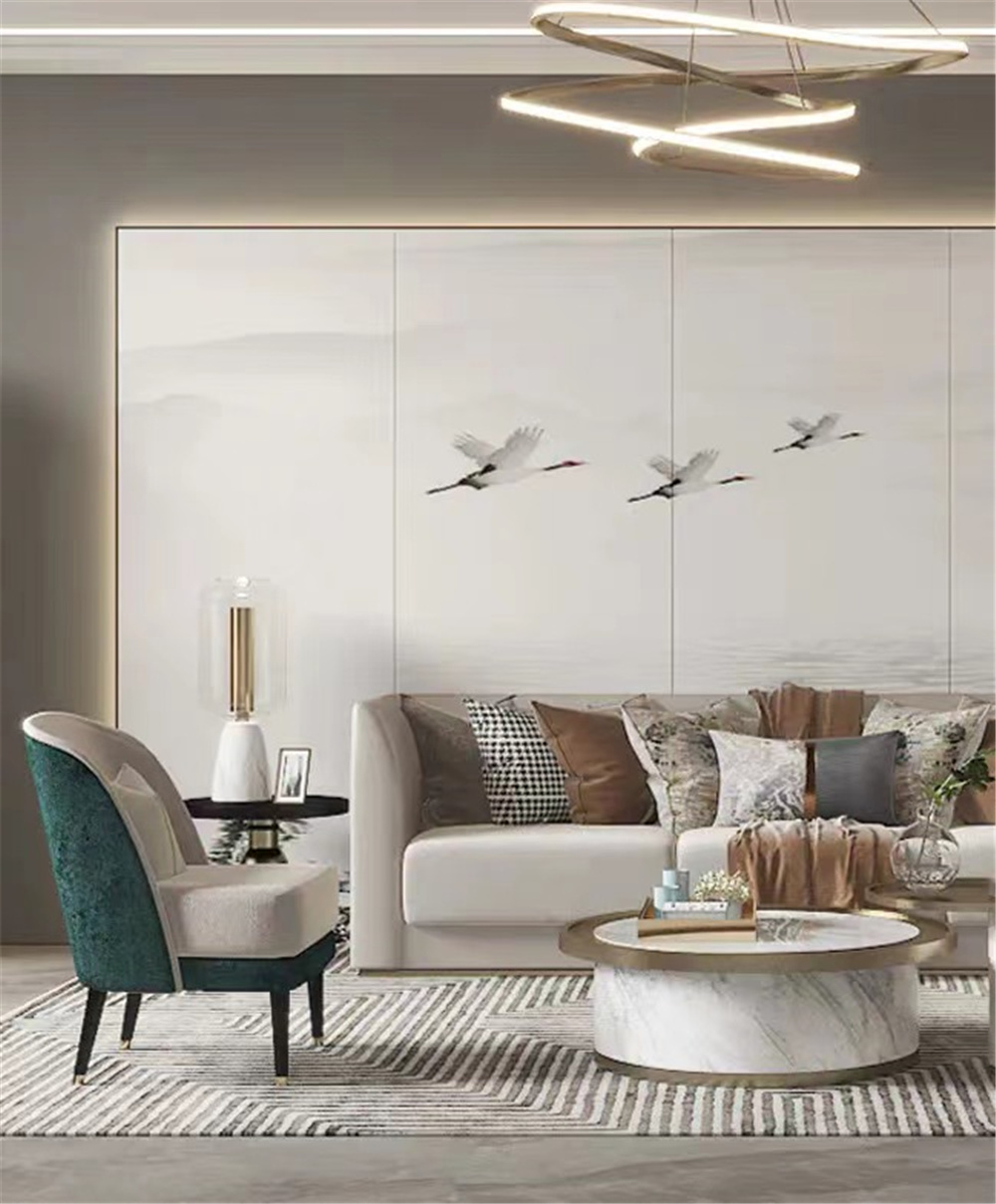 Soft outfit is equipped with leather cloth sofa, light luxury metal marble tea table, artistic lamp, as well as emerald leisure chair ornament, each place is exquisite luxury.