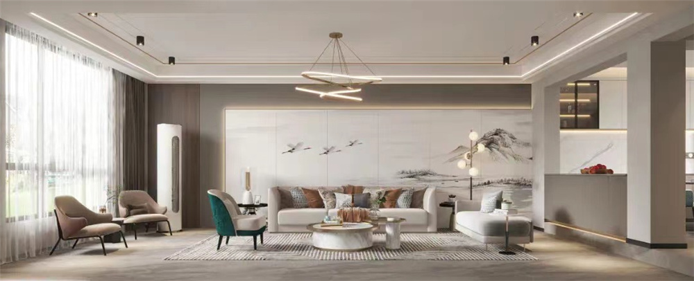 客廳最能代表一個家的審美格調,電視背景墻設計靈感加入了中國風的水墨石材和木飾面結合,以傳統文化的內斂沉穩為出發點,融入現代設計語言,為空間注入了唯美的古典情韻。沙發背景墻氛圍燈的虛化提升空間格調,同樣是中國水墨畫的元素與電視背景呼應,傳遞了業主情有獨鐘的中國風情節。 The living room can represent the aesthetic style of a home, TV background wall design inspiration to join the combination of Chinese ink stone and wood veneer, with the traditional culture of introversion and stability as the starting point, into the modern design language, for the space into a beautiful classical charm. The void of the atmosphere lamp on the sofa background wall improves the space style, and the elements of Chinese ink painting echo with the TV background, conveying the owner's favorite Chinese style.