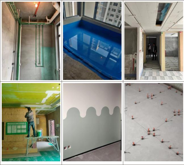 防水涂刷:衛生間墻面防水均滿刷,采用“十字交叉法”進行涂刷,涂刷均勻不透底為標準。每個衛生間均預留二次排水地漏。