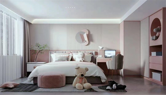 The master bedroom integrates the north room into the master bedroom space, adding the function of cloakroom, making the master bedroom more perfect, with the function and volume of a large flat floor. 女兒房