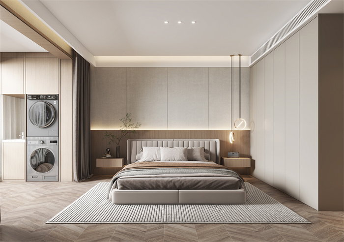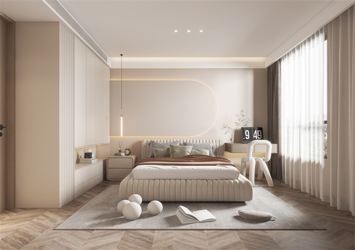 通過客餐廳一體的設計,客廳和玄關的墻面延續至餐廳,自然的銜接了兩個空間,使整個客餐廳的通透性得到提升,暖色燈光溫潤地包裹著餐廳空間,方與圓的結合,用空間與燈光牽引著居者,成全每一刻的即興而至。二樓的開放式的書房也盡顯主人的格調和品味,居家時刻得以放松的好去處,讀讀書喝喝茶,享受家居生活的每一刻。 Through the design of the guest restaurant, the wall of the living room and the porch continues to the restaurant, the natural connection of the two Spaces, so that the permeability of the whole guest restaurant has been enhanced, the warm light is warm and moist wrapped in the restaurant space, the combination of square and round, with space and light traction of the resident, perfect every moment of the impromptu. The open study on the second floor also shows the master's style and taste. It is a good place to relax at home, read books and drink tea, and enjoy every moment of home life. 臥室