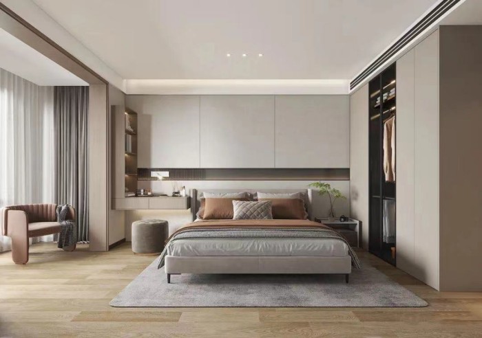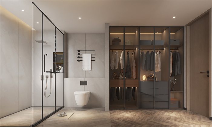 主臥的主題色調仍然是木飾面與暖色調的融合,大大的落地窗,明媚的日光充分灑進房間,設計師用簡單干練的空間線條,與恰到好處的燈光運用,為夜晚氛圍的營造,襯托出溫馨的色彩。 衛生間空間十分寬敞,采用分離式設計,并加入了衣帽間功能,突顯沉穩的質感。 The theme tone of the master bedroom is still the integration of wood veneer and warm colors. The large French Windows fully sprinkle bright daylight into the room. The designer uses simple and efficient space lines and appropriate lighting to create a warm color for the night atmosphere. Bathroom space is very spacious, using a separate design, and the addition of cloakroom function, highlighting the calm texture. 次臥/兒童房