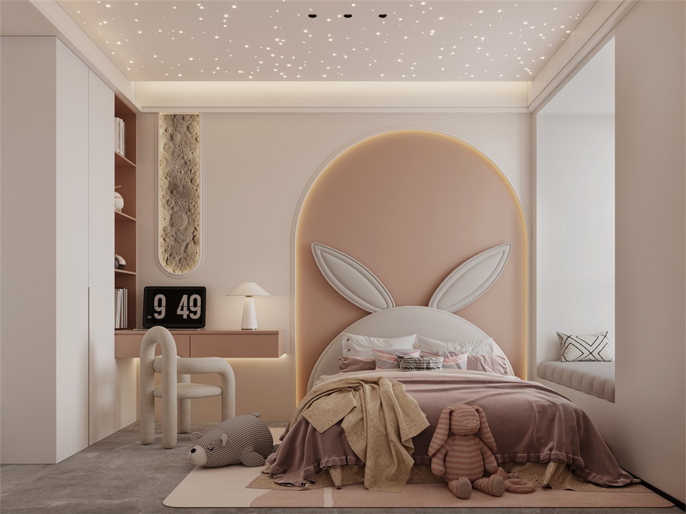 小朋友們總是對世界充滿著無限的好奇與想象。女孩房在主色調(diào)的基礎(chǔ)上增添了粉色用以裝飾,用色彩傳遞情感,浪漫唯美的粉色將藝術(shù)氣息帶入,充滿未知與想象力。