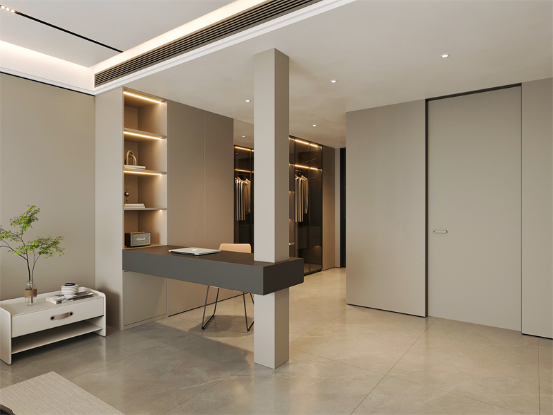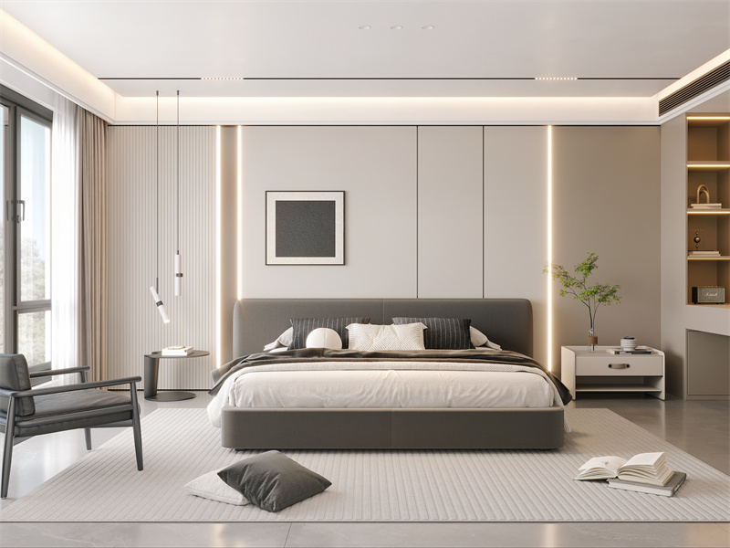 臥室遵循極簡(jiǎn)主義,減少繁瑣的裝潢,致力于打造舒適的睡眠環(huán)境,富有藝術(shù)氣息和觀感,一個(gè)回歸自然之美的角落,沒(méi)有繁華與張揚(yáng),只有恬靜與素雅。家具和諧而靜謐安然,其溫潤(rùn)的材質(zhì)、謙遜的色調(diào),便得以融入這個(gè)沉靜的氛圍中。