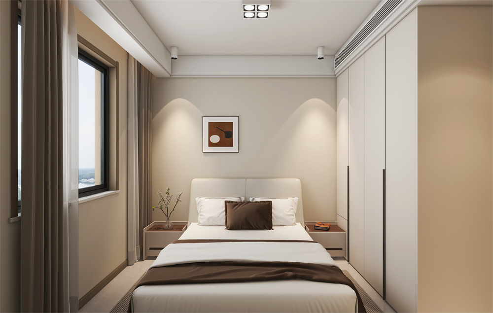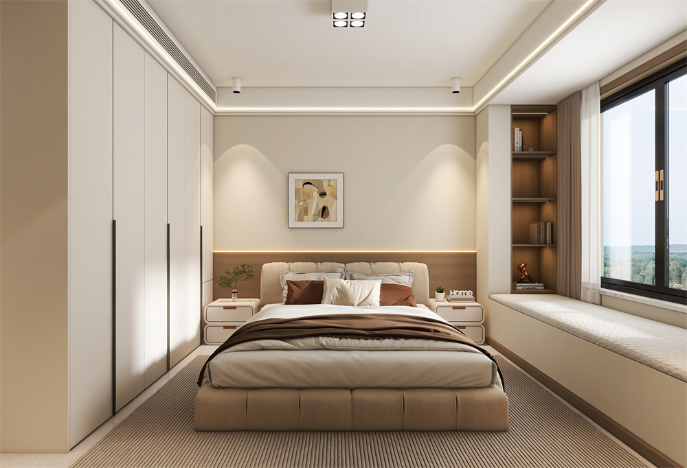 主臥室采用暖灰色奠定溫柔的基調(diào),咖色增添沉穩(wěn)與溫暖,利用飄窗里面的空間做書柜,選擇柔軟舒適的床品,體現(xiàn)房主優(yōu)雅的品味。