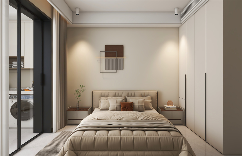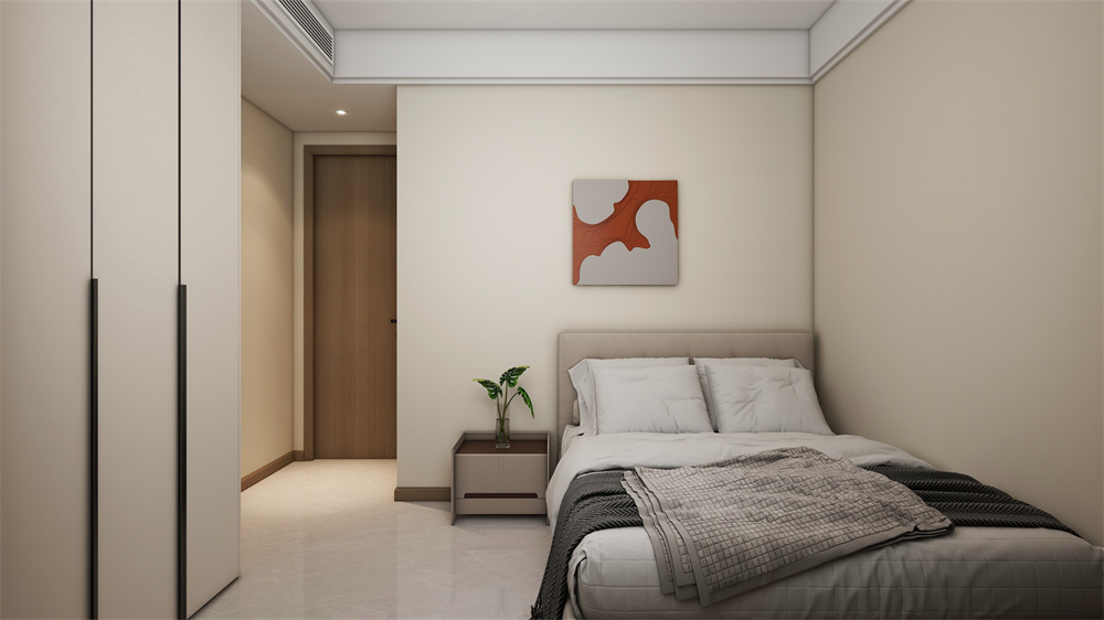 根據(jù)空間結(jié)構(gòu)擺放合適的家具,不做過多的造型,墻面采用暖灰色的乳膠漆,整體溫馨大方,回歸了臥室的主題,在這樣的臥室里放松休息都是一種很好的享受。