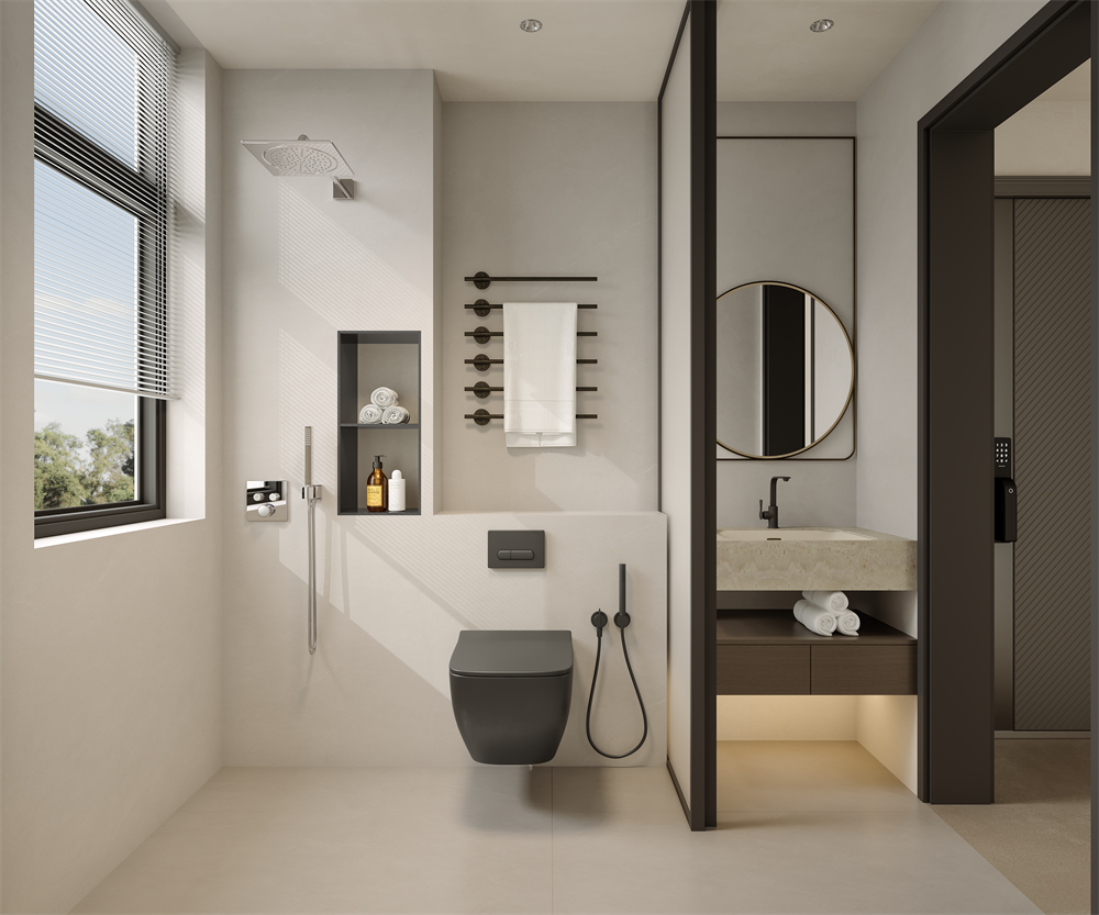 懸掛式的浴室柜和馬桶,隱藏式頂噴花灑,極簡質(zhì)感的衛(wèi)生間,衛(wèi)浴不僅顏值很心動,使用打理起來也確實很方便。