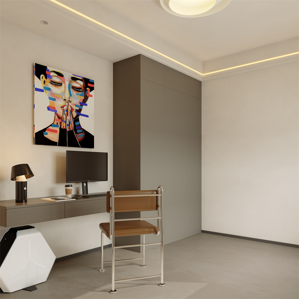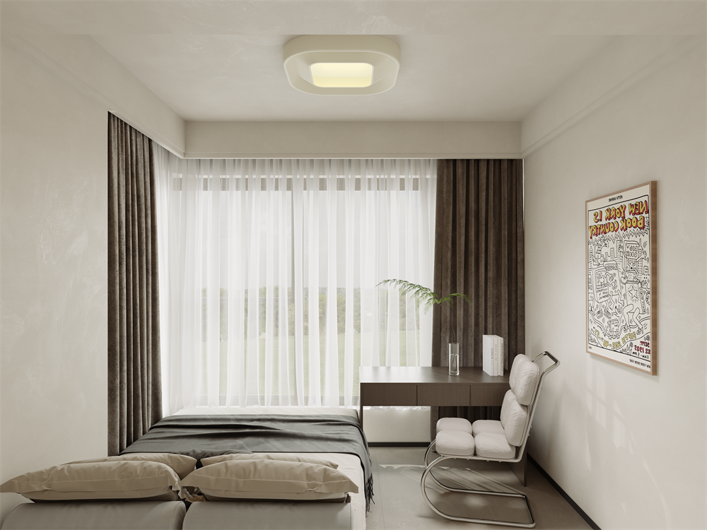 考慮到業(yè)主的需求,設(shè)計師把次臥留白,簡單的書桌可以作為書房來用,靠墻擺放同色系墨菲床不僅視覺效果好看,后期作為次臥來用也是很舒適的。