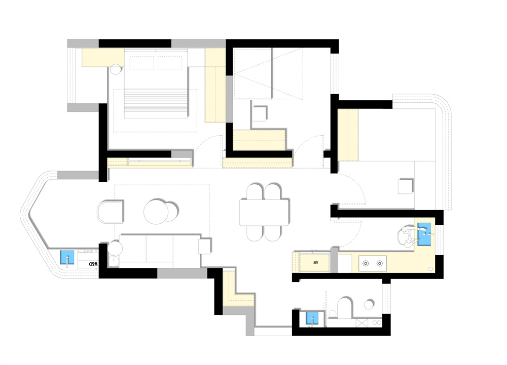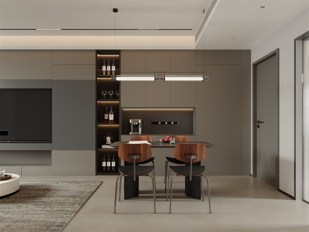 餐邊柜延續(xù)客廳電視柜一體,簡化了空間的元素也更為實用,空間的留白方便了動線的同時也讓空間更為開闊。
