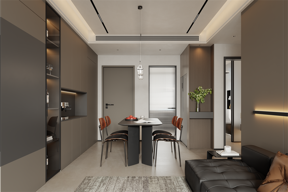 客廳以中性色調(diào)為主,墻面采用木飾面護墻板,為空間帶來溫暖的觸感和自然的氣息,結(jié)合暗黑系沙發(fā)等裝飾,賦予空間沉穩(wěn)氣質(zhì),呈現(xiàn)整個空間的質(zhì)感和層次。