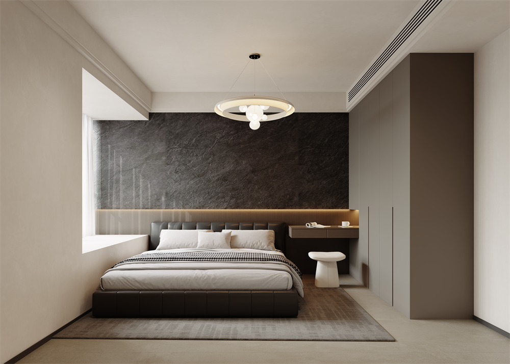 主臥室延續(xù)意式極簡風格,墻面采用pu石材和護墻板搭配,灰咖色的衣柜和嵌入式梳妝臺,節(jié)省空間的同時也保證了視覺的簡潔和統(tǒng)一。