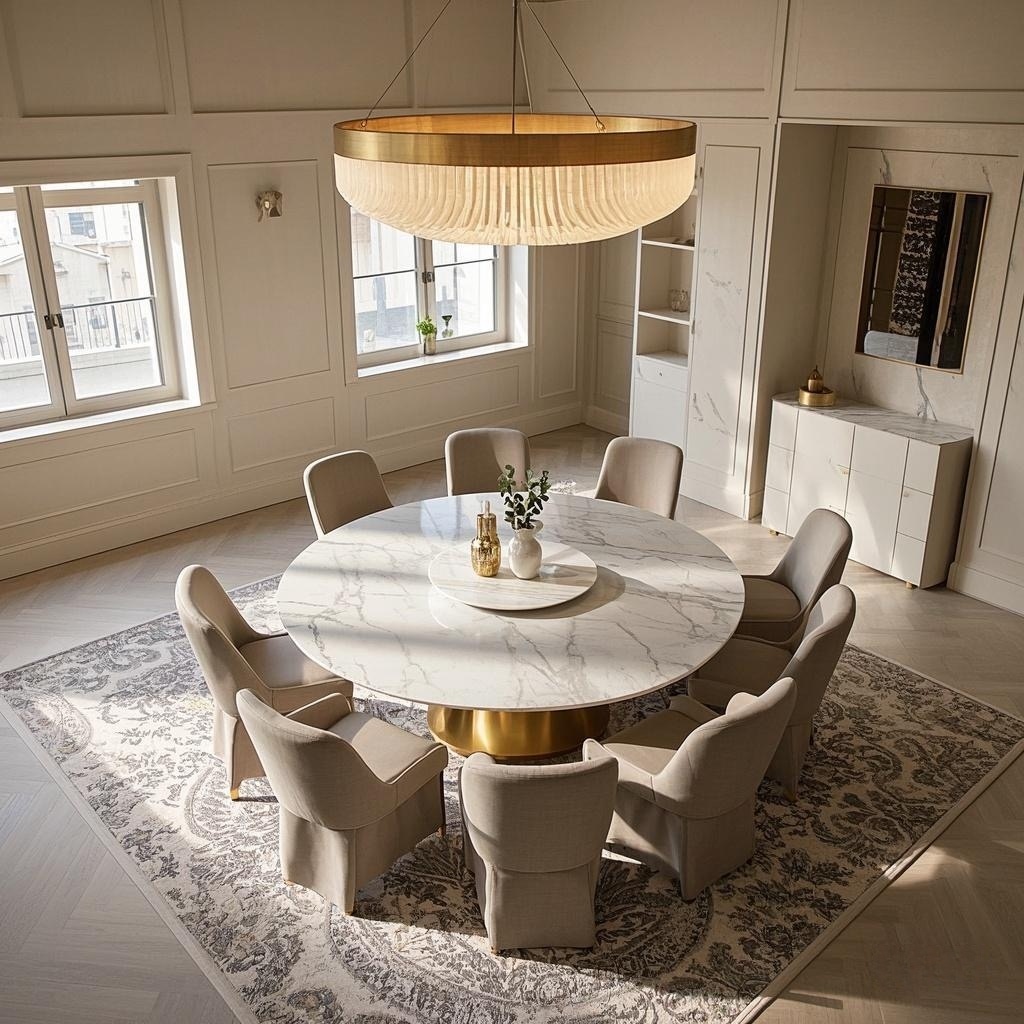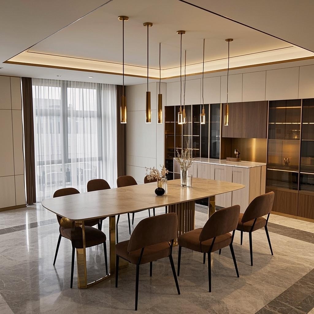 輕奢風(fēng)格一般采用開放式的客餐廳設(shè)計(jì)??蛷d、餐廳與廚房之間沒有明顯的阻隔,空間得以流暢延伸,視覺上更顯開闊大氣。這種布局不僅方便了家庭成員之間的互動(dòng)交流,還讓整個(gè)公共區(qū)域在光線的映照下,顯得通透明亮。