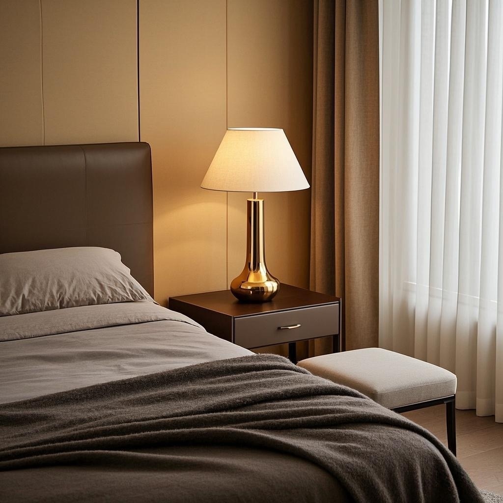 臥室的床頭,擺放著一盞造型獨(dú)特的臺(tái)燈,柔和的光線在夜晚營造出溫馨的氛圍。床尾凳上,隨意搭著一條質(zhì)感上乘的毛毯,為空間增添了一份慵懶與愜意。