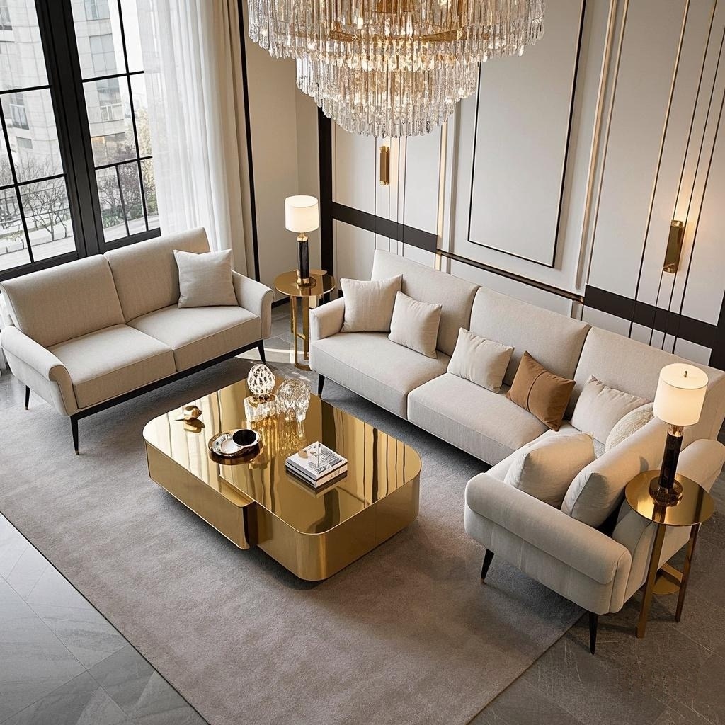 在色彩選擇上,輕奢以高級(jí)灰為主色調(diào),奠定了空間沉穩(wěn)、內(nèi)斂的基調(diào)。灰色的墻面、地面以及部分家具,相互呼應(yīng),營造出寧靜而優(yōu)雅的氛圍。同時(shí),巧妙地運(yùn)用金色元素進(jìn)行點(diǎn)綴,如金色的燈具、裝飾線條、擺件等,為空間注入了奢華質(zhì)感。